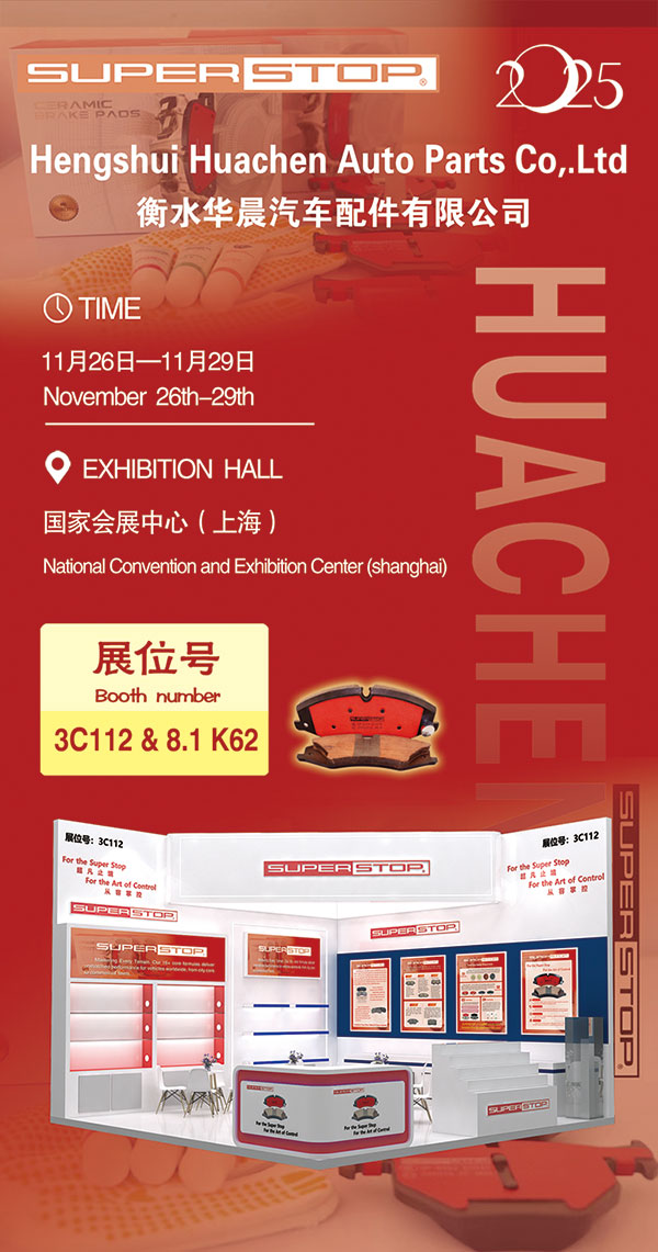 At this exhibition, our core display will focus on "SUPERSTOP", our best-selling brand in the global market. Boasting an innovative high-end aramid ceramic formula and an eye-catching appearance design, SUPERSTOP has secured a significant market share worldwide. Furthermore, with its stable braking performance, long service life, and noise-free operation, it has won widespread trust from customers across the globe. We look forward to exploring market trends and opportunities with our long-term partners, as well as forging solid and long-term partnerships with new clients at this event. We wish you all prosperous business and every success!